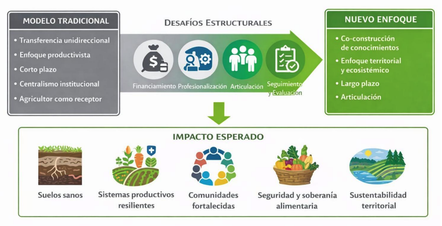Los resultados evidencian un consenso transversal: la necesidad de transitar desde un modelo de extensión vertical centrado principalmente en la productividad, hacia un enfoque horizontal, participativo, territorial, interdisciplinario y de largo plazo. Conceptos como comunidad, aprendizaje, comunicación, empatía, conocimiento y progreso se reiteraron en las intervenciones del público, reflejando una visión que pone en el centro a las personas, los territorios y la co-construcción de saberes, por sobre la simple transferencia unidireccional de tecnologías.
